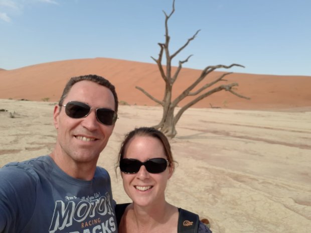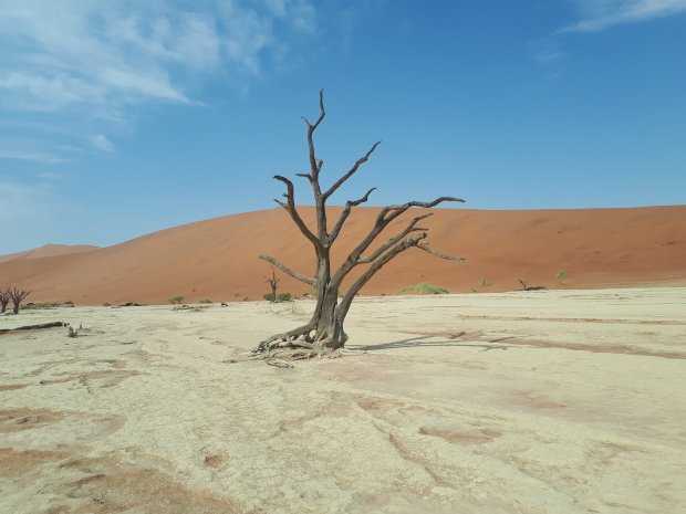 Vroeg op dus, want sossusvlei schijnt het mooiste te zijn met ochtendlicht. Helaas geen ochtendlicht deze ochtend, maar speciaal voor ons een mooie grijze dekenpartij. Gelukkig breekt de zon een paar uurtjes later door voor wat leuke foto’s, en hete wandelingen door de dodevlei en de sossusvlei.