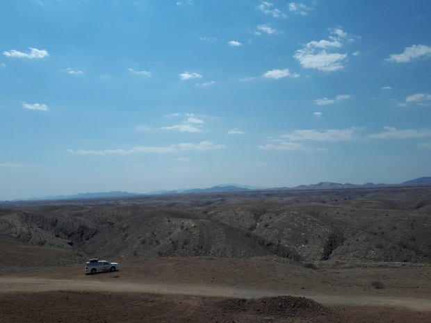 Ja hoor, de “bumpy road goes on”, met 90 km per uur sjeest raimon over de gravel, zodat de bulten wat minder voelbaar zijn. Wat het allemaal dubbel en dik waard maakt zijn de uitzichten. Ik wist niet dat droogte ook zoveel gezichten had, het landschap gaat van rood naar geel en van canyon naar bergen. We zien stokstaartjes, veel gemsbokken en struisvogels: