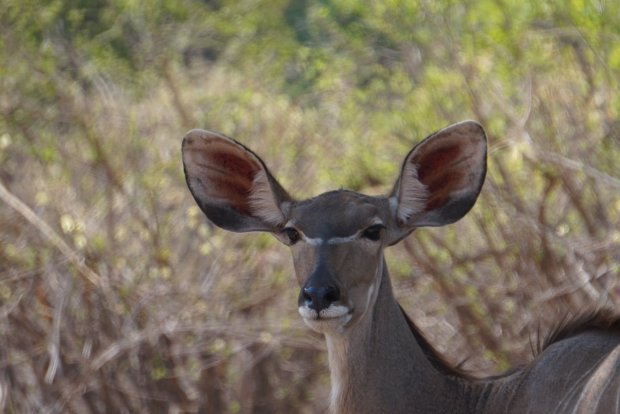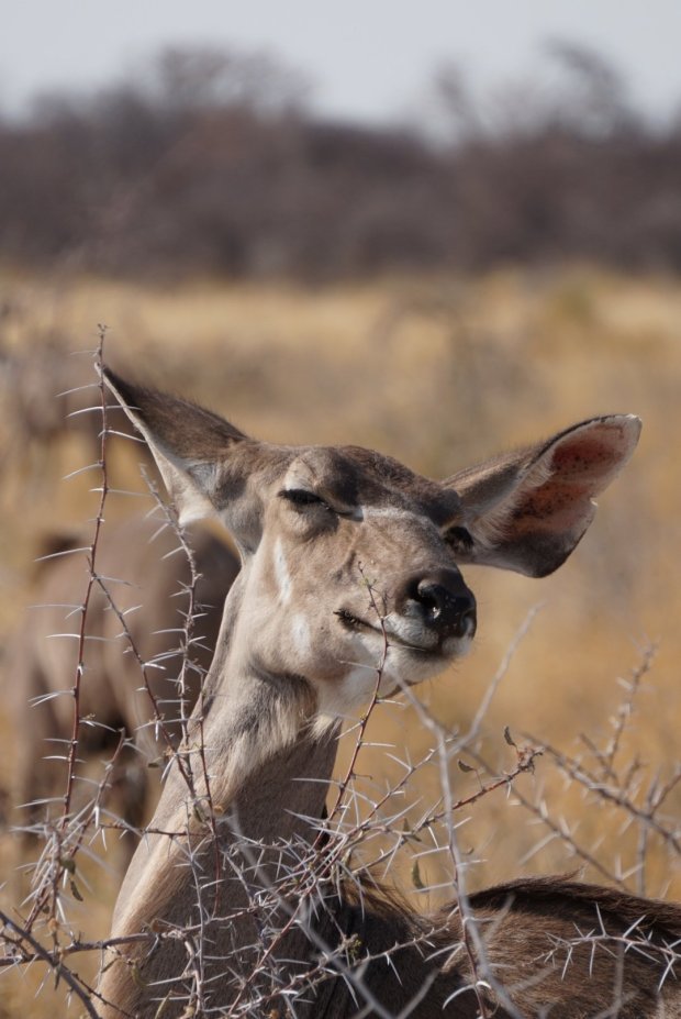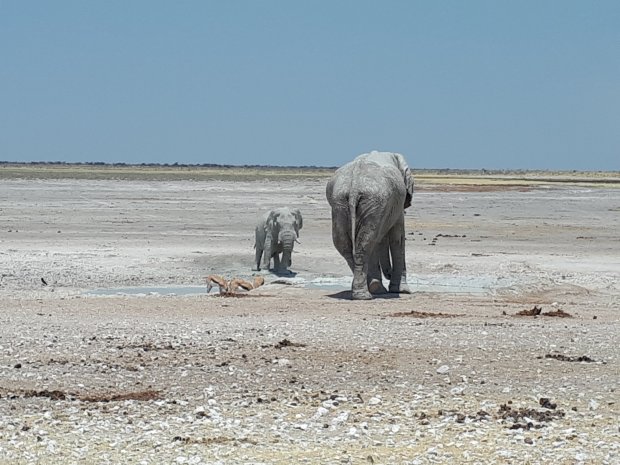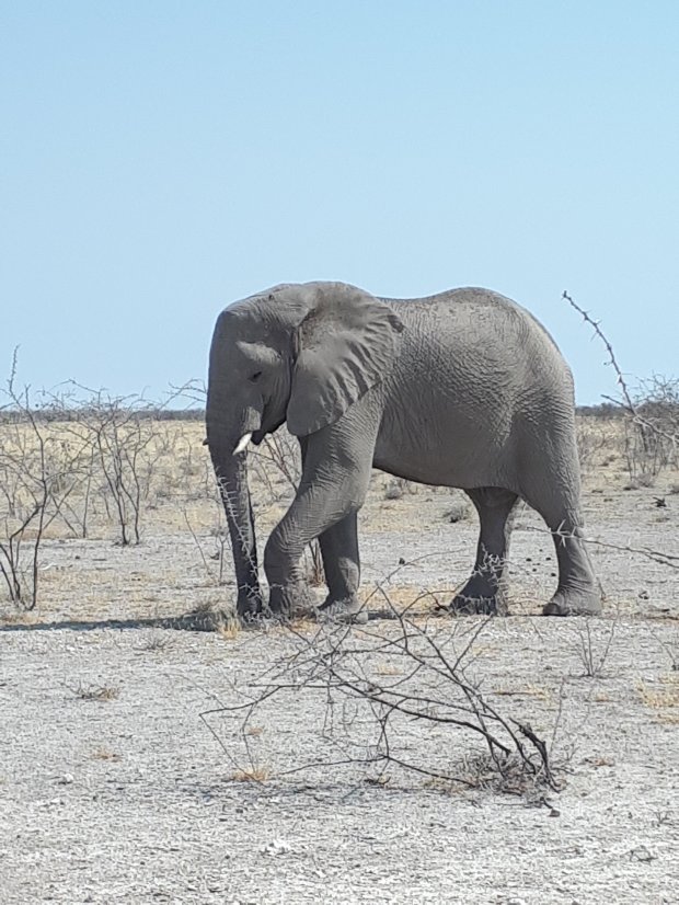 Gelukkig komen de meeste beesten naar je toe, want de wegen zijn barslecht in Etosha, je hele keukeninventaris schuddeld door de camper heen en de potten pasta saus zijn niet meer veilig. Er is dus geen beest in het hele park dat je niet hoort aankomen en je de kont toekeert om snel tussen de struiken te kruipen.