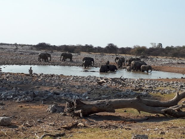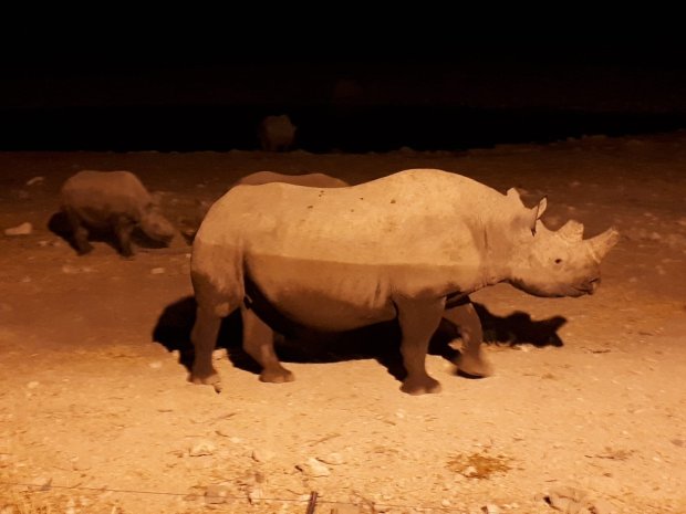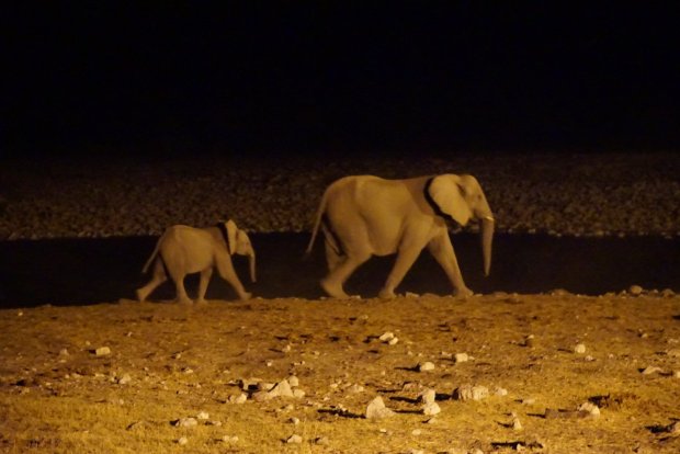 De eerste avond in het park sliepen we in Okaukuejo rest camp. Deze waterhole sloeg echt alles, we hebben er van 18:30 tot half 22:30 aangezeten met een flesje wijn erbij en de olifanten, giraffen, neushoorns en nog veel meer wisselde elkaar af voor je ogen: