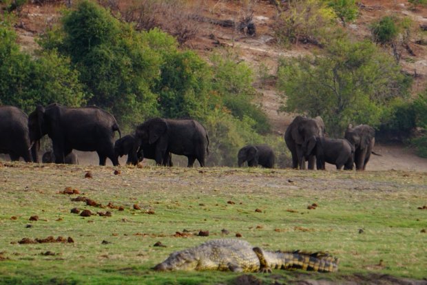 Wel 150.000 olifanten zijn er in het nationale park van Chobe en niet van die kleintjes, maar de grootste van Afrika en nog veel meer andere beestjes. Het is een enorm park, dat nergens afgezet is, dus de beesten kunnen alle kanten op, eigenlijk heel Botswana of Zimbabwe in en steken dus ook regelmatig gewoon de autoweg over of zijn ze te vinden in plaatsen rond het park.